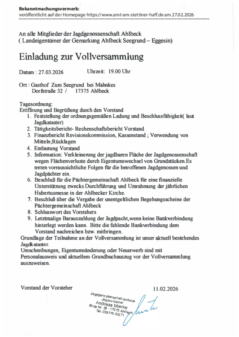 Der Eggesiner Präsident der Stadtvertretung Gerhard Tewis bietet den Einwohnern von Eggesin bedarfsgerechte Sprechzeiten an. Interessierte Bürgerinnen und Bürger werden gebeten, sich für eine individuelle Terminvereinbarung......lesen